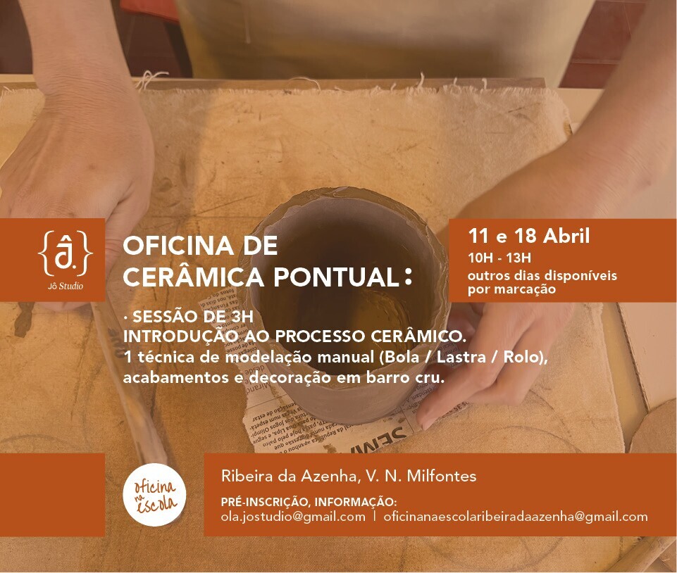 Breve introdução à cerâmica, técnica de modelação manual (Bola / Lastra / Rolinho), acabamentos e decoração em barro cru. Inclui todos os materiais e 1 cozedura.