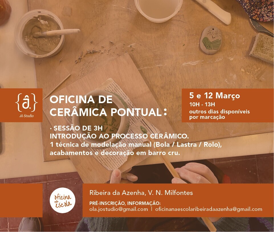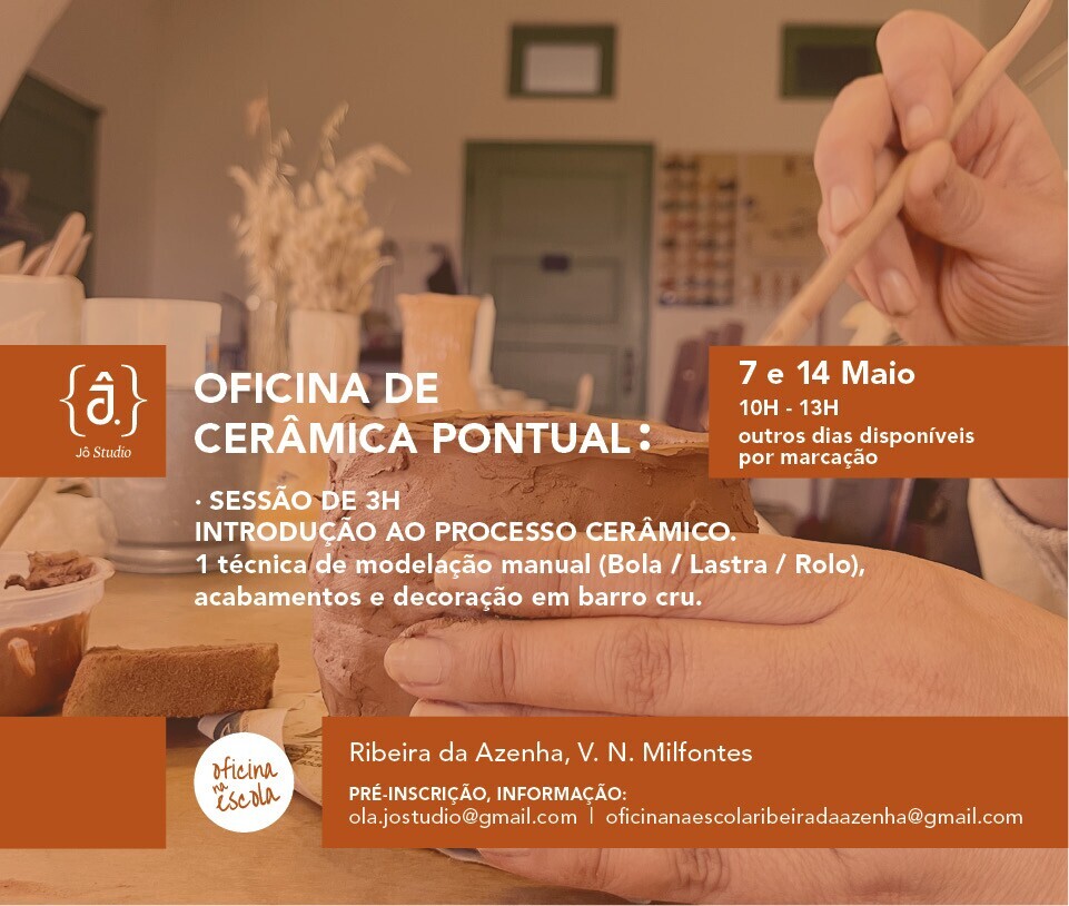 Breve introdução à cerâmica, técnica de modelação manual (Bola / Lastra / Rolinho), acabamentos e decoração em barro cru. Inclui todos os materiais e 1 cozedura.